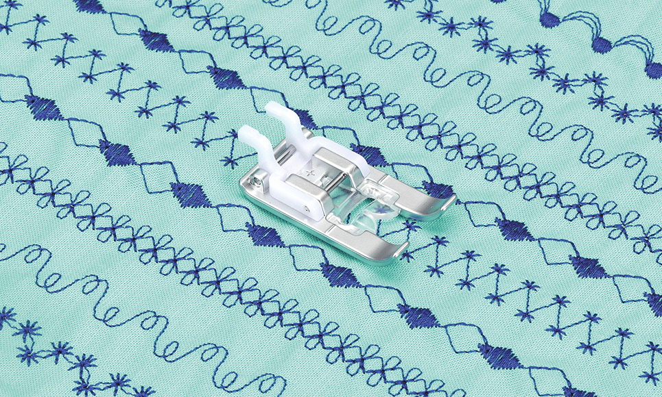 The new N+ foot has a durable coating for feeding fabric smoothly. The plastic guide helps to minimize the misalignment of the material. Perfect for sewing monogramming, decorative, satin and alphabet lettering stitches where more visibility is needed.